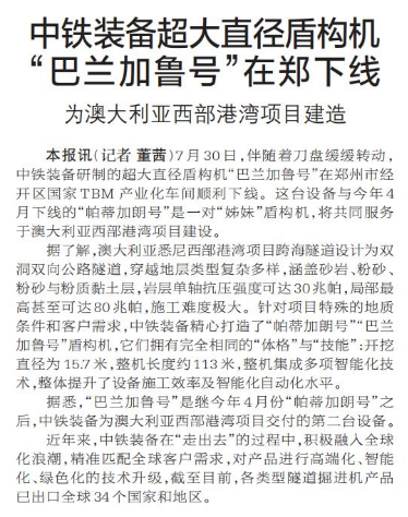 7月30日,伴随着刀盘缓缓转动,中铁装备研制的超大直径盾构机“巴兰加鲁号”在郑州市经开区国家TBM产业化车间顺利下线。这台设备与今年4月下线的“帕蒂加朗号”是一对“姊妹”盾构机,将共同服务于澳大利亚西部港湾项目建设。(今日《郑州日报》2版)