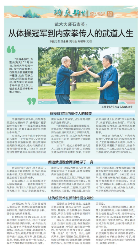 “莫道桑榆晚,为霞尚满天!”7月28日,郑州大学校园一隅,当代内家拳泰斗石崇英身躯清瘦却精神矍铄,他时而静立如松,时而如游龙旋动,将力学与武道融于举手投足之间,让诸多武术爱好者和传承人惊叹。(今日《郑州日报》5版)