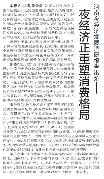 发展夜经济作为文旅产业提质升级的重要路径,是扩大消费需求、拉动经济增长的务实举措,也是创造美好生活的有效载体。省地方经济社会调查队日前发布的河南夜经济集聚区发展情况调研报告显示,在政策引领和创新赋能下,我省夜经济呈现良好发展态势,以强大势能重塑消费格局,成为激活市场潜力、驱动经济增长的新引擎。(今日《郑州日报》6版)