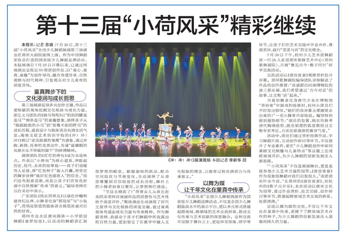 7月30日,第十三届“小荷风采”全国少儿舞蹈展演第三场演出在郑州大剧院温情上演。作为中国舞蹈家协会打造的国家级少儿舞蹈品牌活动,本届展演自7月28日开幕以来,已通过两场演出呈现近60部原创作品,以“童心、童真、童趣”为创作导向,融合非遗传承、自然观察与时代精神,引发观众对少儿美育的深度共鸣。(今日《郑州日报》8版)