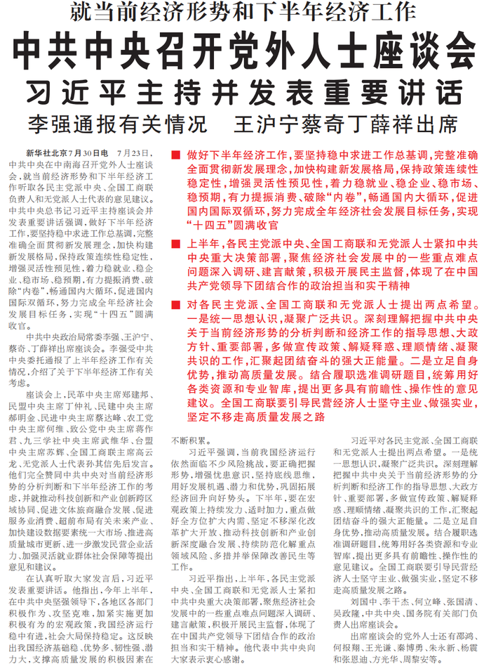 7月23日,中共中央在中南海召开党外人士座谈会,就当前经济形势和下半年经济工作听取各民主党派中央、全国工商联负责人和无党派人士代表的意见建议。中共中央总书记习近平主持座谈会并发表重要讲话强调,做好下半年经济工作,要坚持稳中求进工作总基调,完整准确全面贯彻新发展理念,加快构建新发展格局,保持政策连续性稳定性,增强灵活性预见性,着力稳就业、稳企业、稳市场、稳预期,有力提振消费、破除“内卷”,畅通国内大循环,促进国内国际双循环,努力完成全年经济社会发展目标任务,实现“十四五”圆满收官。(今日《人民日报》1版)