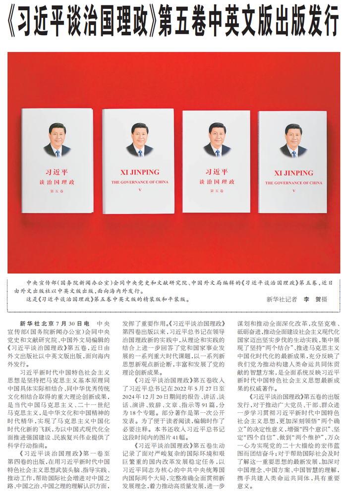 中央宣传部(国务院新闻办公室)会同中央党史和文献研究院、中国外文局编辑的《习近平谈治国理政》第五卷,近日由外文出版社以中英文版出版,面向海内外发行。(今日《人民日报》1版)