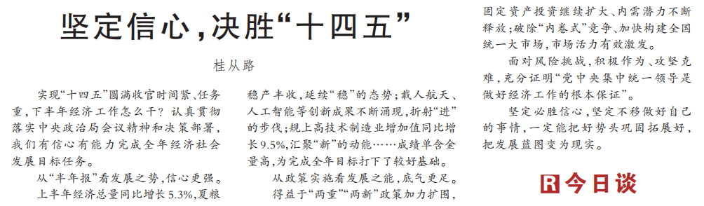 实现“十四五”圆满收官时间紧、任务重,下半年经济工作怎么干?认真贯彻落实中央政治局会议精神和决策部署,我们有信心有能力完成全年经济社会发展目标任务。(今日《人民日报》1版)