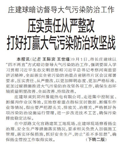 9月1日,市长庄建球以“四不两直”方式暗访督导大气污染防治工作,强调要深入学习贯彻习近平生态文明思想和习近平总书记考察河南重要讲话精神,全面落实全省污染防治重点省辖市片区会议部署要求,压实责任、从严整改,以更加鲜明态度、更加严格标准、更加过硬措施推进大气污染防治攻坚各项工作,确保生态环境质量明显改善、全面改善、持续改善。(今日《郑州日报》1版、2版)