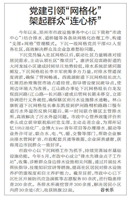 今年以来,郑州市市政设施事务中心结合排水、道桥隧等各条块网格化治理工作,构建“支部+网格”管理模式。下沉一级网格党员干部62人至各社区,高效解决群众及企业急难愁盼问题。(今日《郑州日报》2版)
