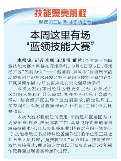 全国第三届职业技能大赛本月将在郑州举行。9月4日至5日,郑州经开区“先赛为快”——“迎国赛、展风采”技能展演活动暨郑州经济技术开发区第三届职业技能大赛将在经开区凤河东街77号安康应急安全实训基地举行。(今日《郑州日报》2版)