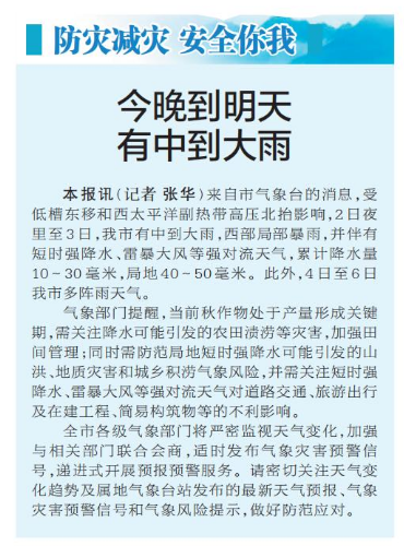 来自市气象台的消息,受低槽东移和西太平洋副热带高压北抬影响,2日夜里至3日,我市有中到大雨,西部局部暴雨,并伴有短时强降水、雷暴大风等强对流天气,累计降水量10~30毫米,局地40~50毫米。此外,4日至6日我市多阵雨天气。(今日《郑州日报》2版)