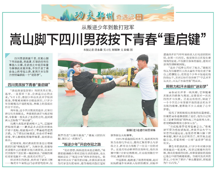 四川男孩跨越千里,在嵩山脚下寻回自我,将逃课、打架的任性往事抛入云烟,在武校之中经历味蕾与拳锋的双重淬炼,不但开启了搏击场上的夺冠之路,更用汗水与努力悄悄编织起一个“迷彩梦”。(今日《郑州日报》6版)