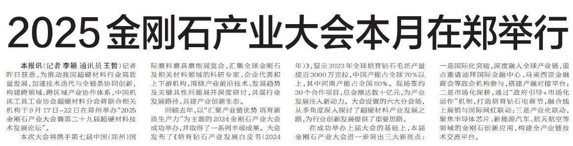 记者昨日获悉,为推动我国超硬材料行业高质量发展,加速技术迭代与全链条协同创新,构建跨领域、跨区域产业协作体系,中国机床工具工业协会超硬材料分会将联合相关机构于9月17日~22日在郑州举办“2025金刚石产业大会暨第二十九届超硬材料技术发展论坛”。(今日《郑州日报》7版)