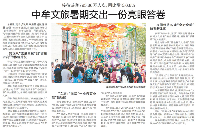2025年暑期,当全国文旅市场以“民俗体验热”“亲子沉浸潮”“科技赋能风”勾勒出消费升级新图景时,河南中牟凭借“主题乐园集群+农商文旅融合+数字科技赋能”的创新实践,交出了一份亮眼答卷:暑期累计接待游客795.86万人次,同比增长6.8%,以“幻乐之城”的鲜明标识,成为全国县域文旅高质量发展的生动样本。(今日《郑州日报》7版)