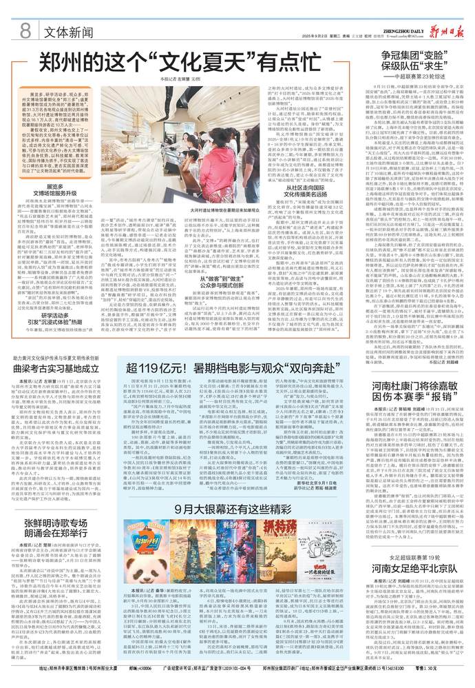 展览多、研学活动多、观众多,郑州文博场馆暑期化身“郑三多”;盛夏酷暑博物馆成为热闹的“避暑胜地”,超31.3万名各地观众接连到访郑州博物馆、大河村遗址博物馆近两月接待观众16.1万人次、商代都城遗址博物院暑期接待游客近10万人次……(今日《郑州日报》8版)