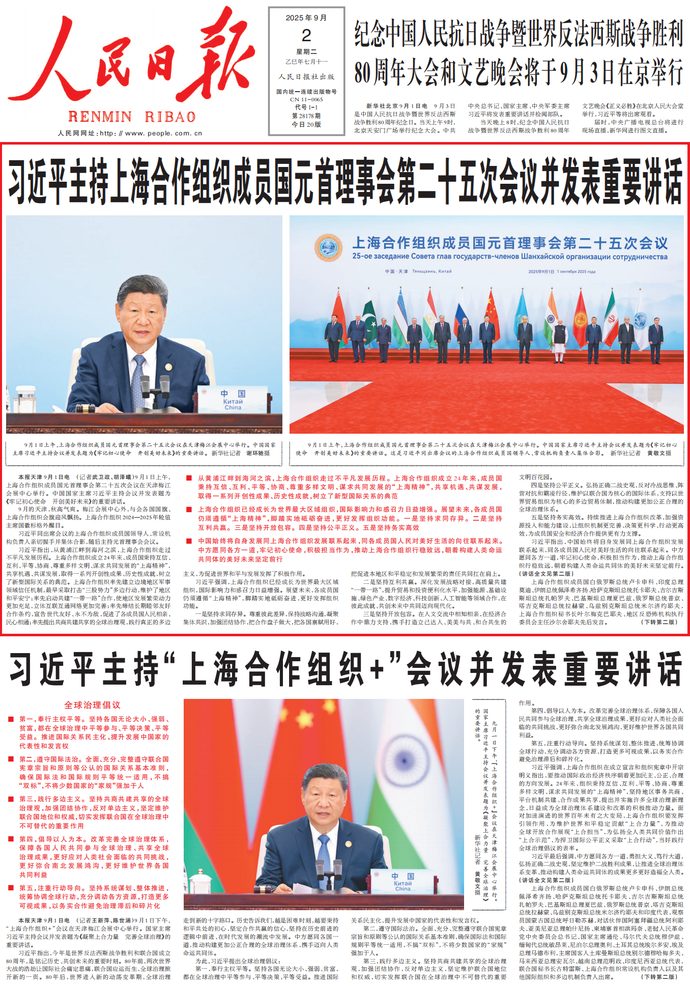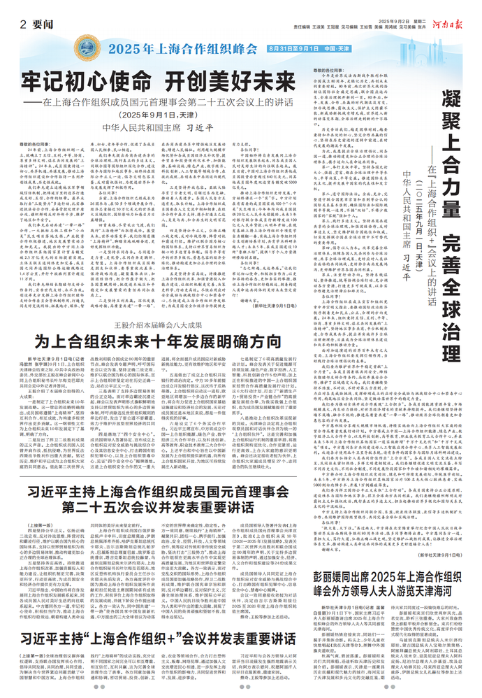 9月1日上午,上海合作组织成员国元首理事会第二十五次会议在天津梅江会展中心举行。中国国家主席习近平主持会议并发表题为《牢记初心使命 开创美好未来》的重要讲话。(今日《人民日报》1版、2版)