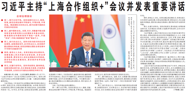 9月1日下午,“上海合作组织+”会议在天津梅江会展中心举行。国家主席习近平主持会议并发表题为《凝聚上合力量 完善全球治理》的重要讲话。(今日《人民日报》1版、2版)