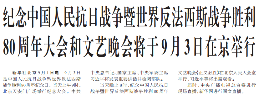 纪念中国人民抗日战争暨世界反法西斯战争胜利80周年大会和文艺晚会将于9月3日在京举行