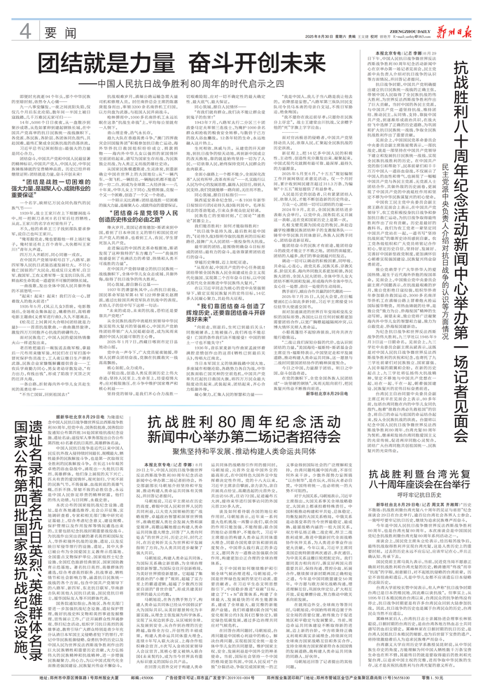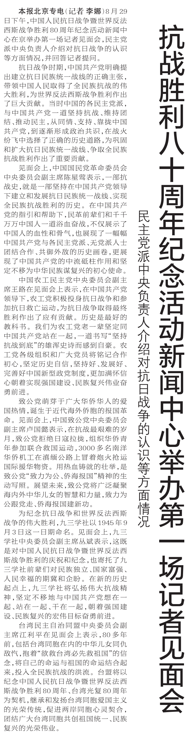 8月29日下午,中国人民抗日战争暨世界反法西斯战争胜利80周年纪念活动新闻中心在京举办第一场记者见面会,民主党派中央负责人介绍对抗日战争的认识等方面情况,并回答记者提问。(今日《郑州日报》4版)