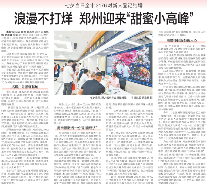 2025年8月29日,农历七月初七,这座充满活力的城市——郑州,沉浸在浪漫的氛围中,各个婚姻登记处成为幸福的汇聚地。无数对新人怀着对未来的憧憬,携手走进婚姻登记处,开启人生新的篇章。(今日《郑州日报》2版)