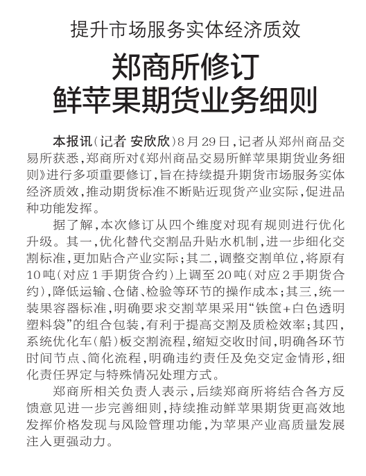 8月29日,记者从郑州商品交易所获悉,郑商所对《郑州商品交易所鲜苹果期货业务细则》进行多项重要修订,旨在持续提升期货市场服务实体经济质效,推动期货标准不断贴近现货产业实际,促进品种功能发挥。(今日《郑州日报》2版)