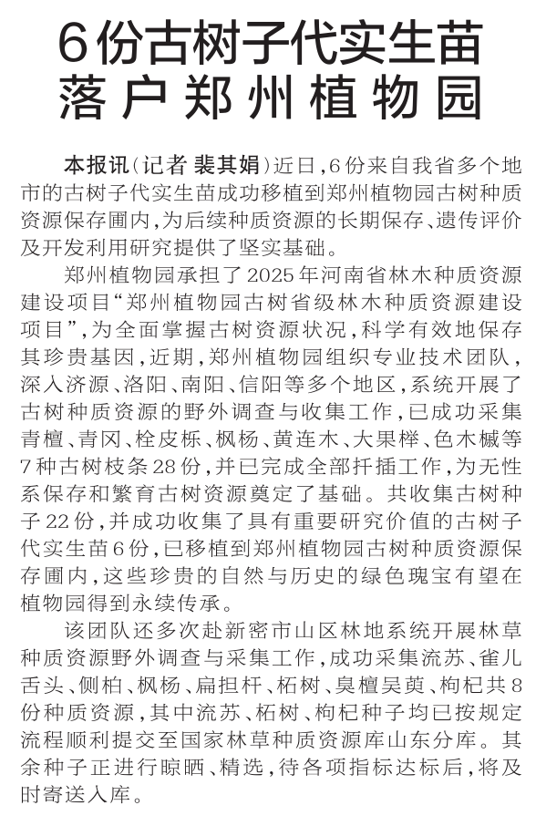 近日,6份来自我省多个地市的古树子代实生苗成功移植到郑州植物园古树种质资源保存圃内,为后续种质资源的长期保存、遗传评价及开发利用研究提供了坚实基础。(今日《郑州日报》1版)