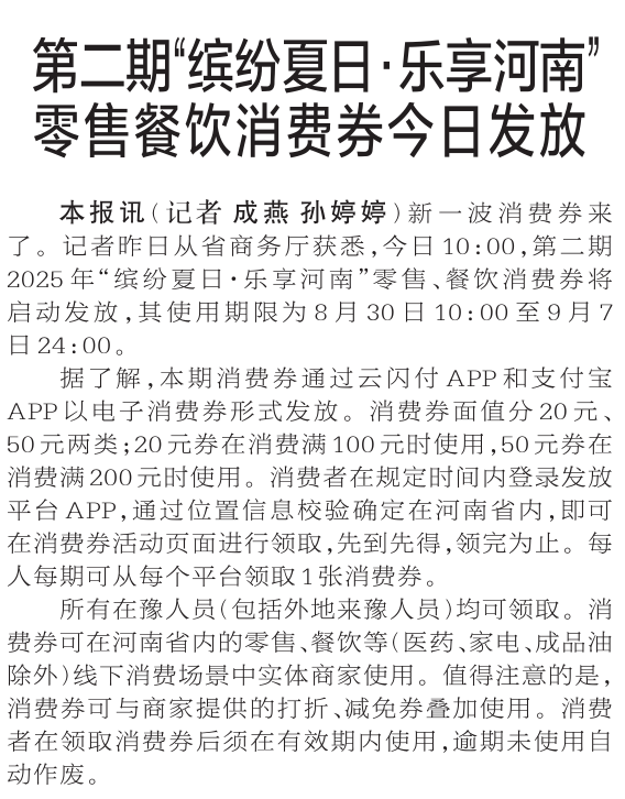 新一波消费券来了。记者昨日从省商务厅获悉,今日10:00,第二期2025年“缤纷夏日·乐享河南”零售、餐饮消费券将启动发放,其使用期限为8月30日10:00至9月7日24:00。(今日《郑州日报》1版)