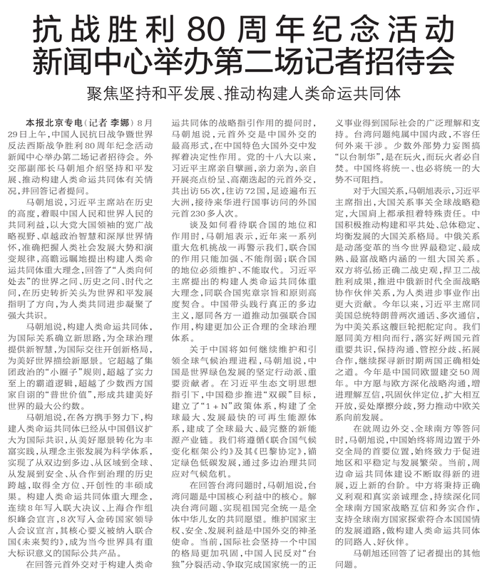 8月29日上午,中国人民抗日战争暨世界反法西斯战争胜利80周年纪念活动新闻中心举办第二场记者招待会。外交部副部长马朝旭介绍坚持和平发展、推动构建人类命运共同体有关情况,并回答记者提问。
