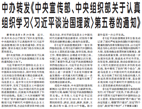 中办转发《中央宣传部、中央组织部关于认真组织学习〈习近平谈治国理政〉第五卷的通知》