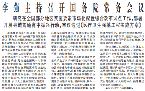 国务院总理李强8月29日主持召开国务院常务会议,研究在全国部分地区实施要素市场化配置综合改革试点工作,部署开展县域普通高中振兴行动,审议通过《医疗卫生强基工程实施方案》。(今日《人民日报》1版)