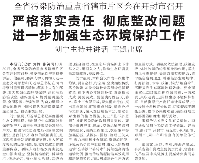 8月29日,全省污染防治重点省辖市片区会在开封市召开,省委书记刘宁主持并讲话。他强调,要深入学习贯彻习近平生态文明思想和习近平总书记在河南考察时重要讲话精神,落实中央有关部署,着力加强生态环境保护,深化污染防治攻坚,确保生态环境质量明显改善、全面改善、持续改善,为奋力谱写中原大地推进中国式现代化新篇章厚植绿色底色。省长王凯出席。(今日《河南日报》1版)