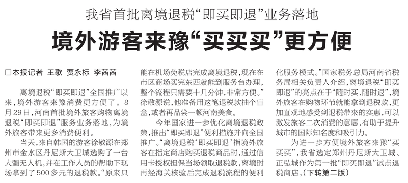 离境退税“即买即退”全国推广以来,境外游客来豫消费更方便了。8月29日,河南首批境外旅客购物离境退税“即买即退”服务业务落地,为境外旅客带来更多消费便利。(今日《河南日报》1版、2版)