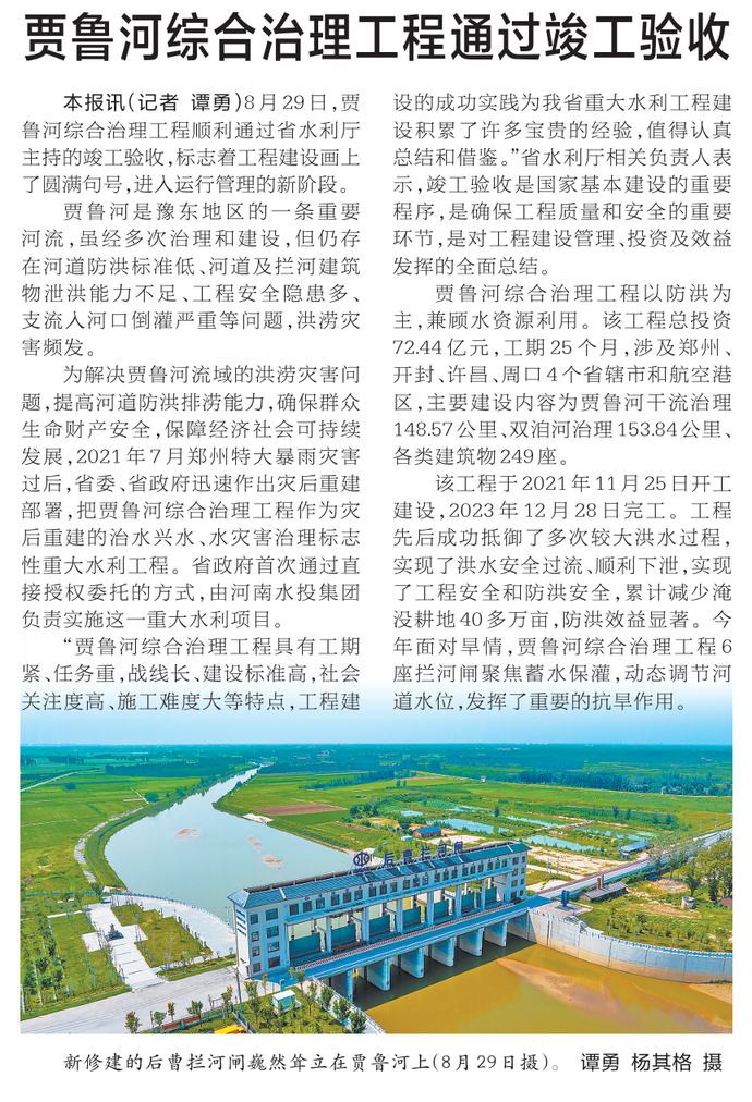 8月29日,贾鲁河综合治理工程顺利通过省水利厅主持的竣工验收,标志着工程建设画上了圆满句号,进入运行管理的新阶段。(今日《河南日报》2版)