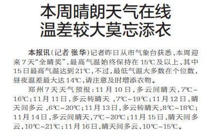 记者昨日从市气象台获悉,本周迎来7天“全晴奖”,最高气温始终保持在15℃及以上,其中15日最高气温达到21℃,不过,最低气温大多数在个位数,昼夜温差最大达14℃,请注意及时增添衣物。(今日《郑州日报》1版)