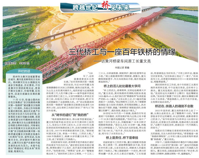 “120年了,这桥就像看着我长大的长辈。”站在郑州黄河第一铁路桥旧址旁,年近60岁的董文亮望着静静卧在河床上的钢梁,眼角泛起笑意。作为土生土长的黄河南岸人,他的家庭与这座铁路桥有着三代人的不解之缘——姥爷是新中国成立前的老桥工段工人,父亲为照顾老人举家迁至桥工段,而他自己则从18岁干到退休,把37年光阴都献给了这座钢铁大桥。在“京汉铁路郑州黄河第一铁路桥”建成暨京汉铁路全线通车120周年之际,这位老桥工向我们讲述了“桥与人”的百年故事。(今日《郑州日报》2版)