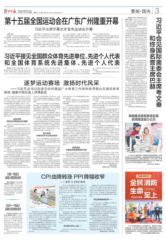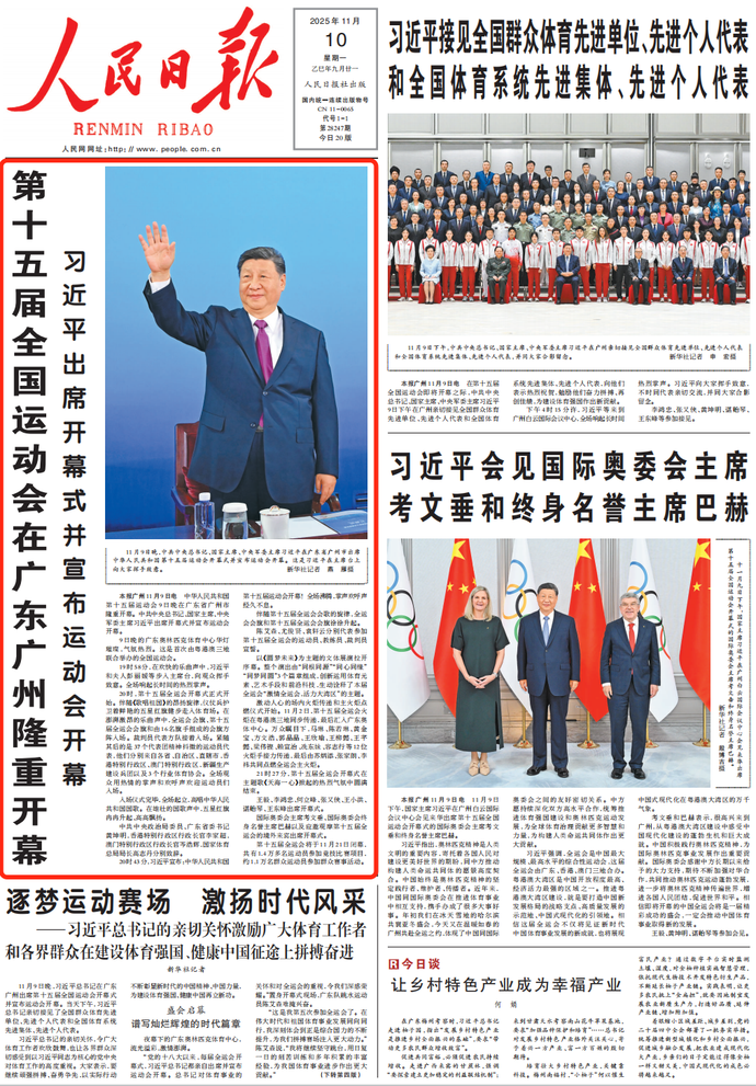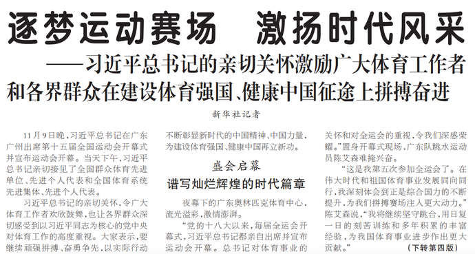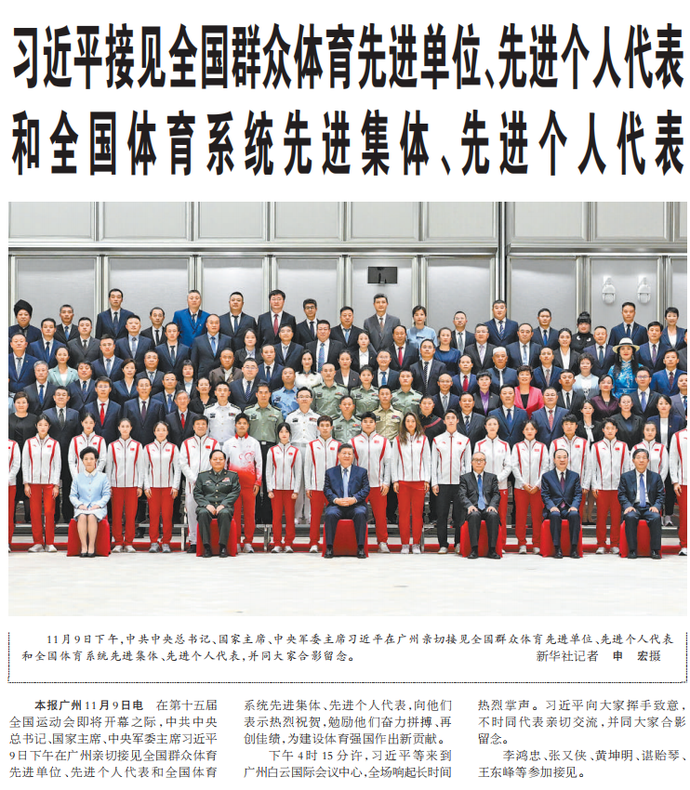 11月9日晚,习近平总书记在广东广州出席第十五届全国运动会开幕式并宣布运动会开幕。当天下午,习近平总书记亲切接见了全国群众体育先进单位、先进个人代表和全国体育系统先进集体、先进个人代表。(今日《人民日报》1版、4版)