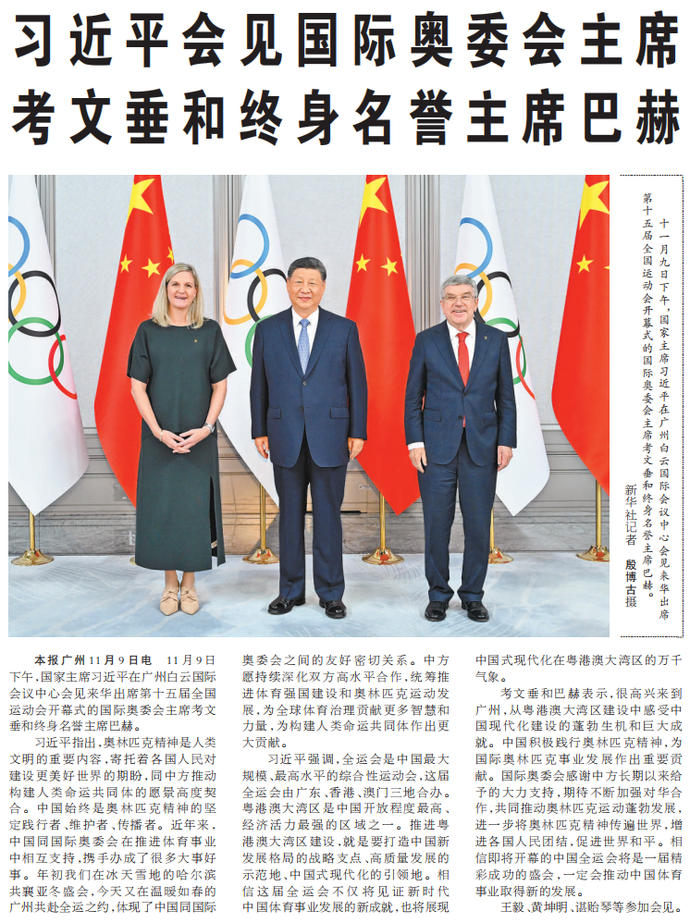 11月9日下午,国家主席习近平在广州白云国际会议中心会见来华出席第十五届全国运动会开幕式的国际奥委会主席考文垂和终身名誉主席巴赫。(今日《人民日报》1版)