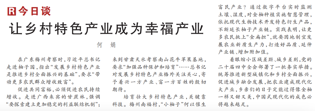 在广东梅州考察时,习近平总书记走进柚子园,指出“发展乡村特色产业是推进乡村全面振兴的基础”,要求“带动更多农民群众增收致富”。(今日《人民日报》1版)