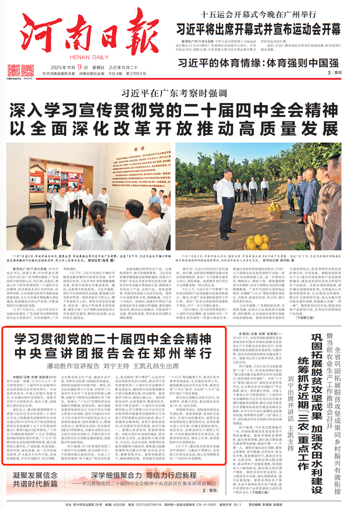 11月8日,学习贯彻党的二十届四中全会精神中央宣讲团走进河南,以报告会、座谈会等形式对全会精神作全面宣讲和深入阐释。(今日《河南日报》2版)