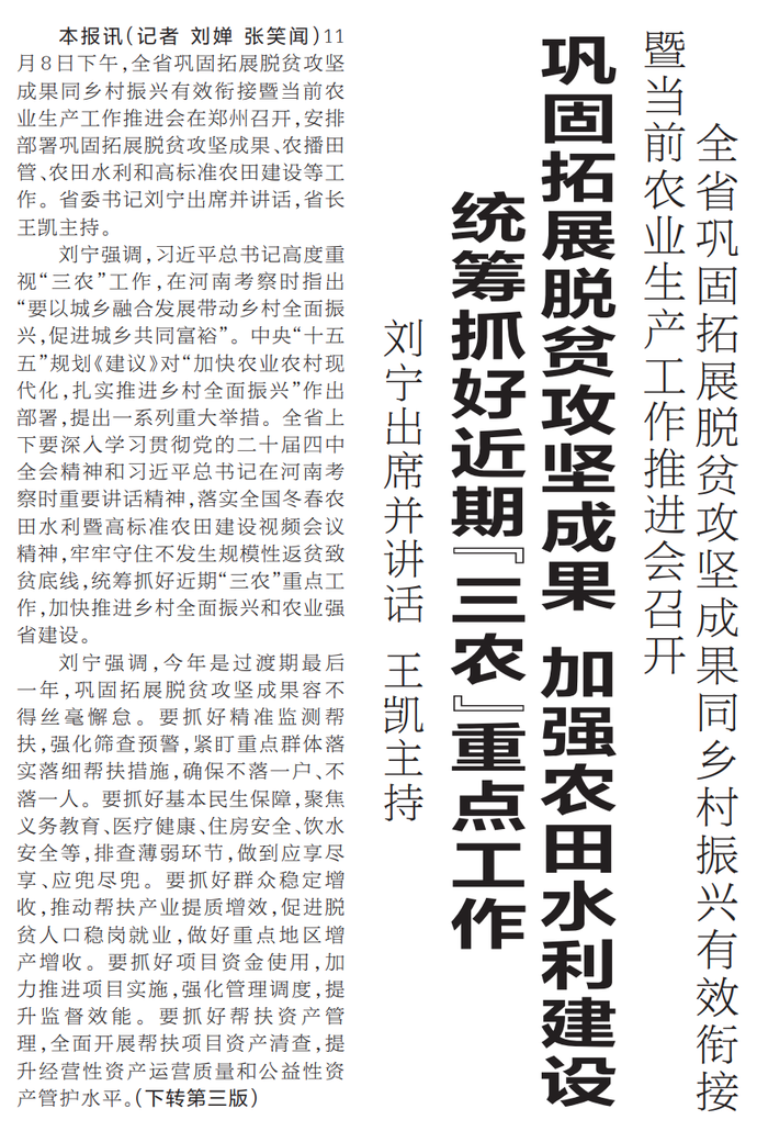 11月8日下午,全省巩固拓展脱贫攻坚成果同乡村振兴有效衔接暨当前农业生产工作推进会在郑州召开,安排部署巩固拓展脱贫攻坚成果、农播田管、农田水利和高标准农田建设等工作。省委书记刘宁出席并讲话,省长王凯主持。(今日《河南日报》1版、3版)
