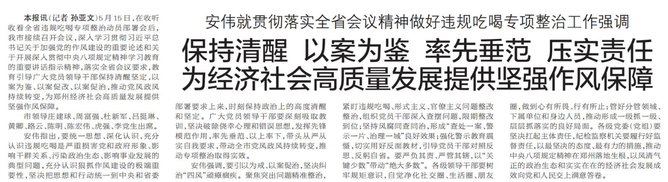5月15日,在收听收看全省违规吃喝专项整治动员部署会后,我市接续召开会议,深入学习贯彻习近平总书记关于加强党的作风建设的重要论述和关于开展深入贯彻中央八项规定精神学习教育的重要讲话指示精神,落实全省会议要求,教育引导广大党员领导干部保持清醒坚定,以案为鉴、以案促改、以案促治,推动党风政风持续转变,为郑州经济社会高质量发展提供坚强作风保障。(今日《郑州日报》1版)