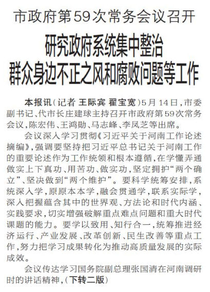 5月14日,市委副书记、代市长庄建球主持召开市政府第59次常务会议,陈宏伟、王鸿勋、马志峰、李凤芝等出席。(今日《郑州日报》1版、2版)