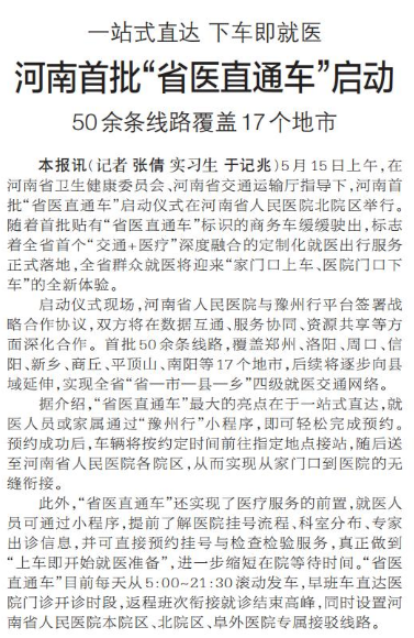 5月15日上午,在河南省卫生健康委员会、河南省交通运输厅指导下,河南首批“省医直通车”启动仪式在河南省人民医院北院区举行。随着首批贴有“省医直通车”标识的商务车缓缓驶出,标志着全省首个“交通+医疗”深度融合的定制化就医出行服务正式落地,全省群众就医将迎来“家门口上车、医院门口下车”的全新体验。(今日《郑州日报》2版)