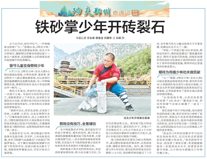从气沉丹田,到开声吐气,一声呐喊掌出砖断!“五一”假期以来,《禅宗少林·音乐大典》山地实景演出现场,功夫少年开砖裂石、腹卧钢叉的硬功表演征服了一波又一波游客,这些震撼人心的场景也成为短视频中的经典瞬间。(今日《郑州日报》5版)