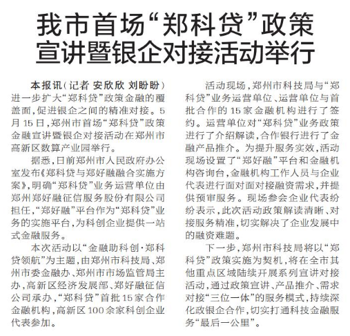 进一步扩大“郑科贷”政策金融的覆盖面,促进银企之间的精准对接。5月15日,郑州市首场“郑科贷”政策金融宣讲暨银企对接活动在郑州市高新区数算产业园举行。(今日《郑州日报》6版)
