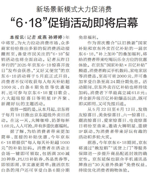 年中将至,为大力拉动消费市场,众多商家纷纷推出多彩的促消费活动接踵而至,备受市民关注的“6·18”促销活动也将全面启动。记者从昨日举行的“2025年京东6·18惊喜开放日”发布会获悉,“又好又便宜”的京东6·18活动将于5月底正式开启,消费者不仅可收获每人每天补贴超1000元、白条6期免息等优惠福利,还可参与京东6·18夏日歌会、六大超级惊喜日等明星IP齐聚、新潮好玩的主题活动。(今日《郑州日报》6版)
