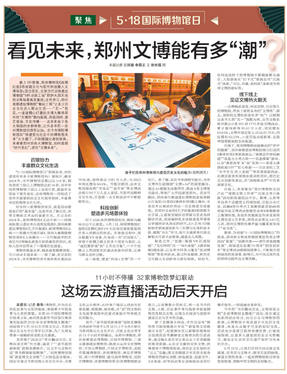 戴上VR眼镜,郑州博物馆《丝绸幻旅》将丝路文化与现代科技搬入文博场馆;混合现实,古荥汉代冶铁遗址博物馆“MR冶铁工场”把炉火照天地的冶炼场景真实重现;全民学习,郑州商都遗址博物院“解码工程”让多少历史文化走入群众生活……“五一”前后,一道道精心打磨的文博大餐将郑州的“文博热”推向新高,科技加持、演艺登场、文化传播……这些来自于各大场馆的全新体验,让许多市民一改对博物馆的固有认知。在今年国际博物馆日“快速变化社会中的博物馆未来”大主题下,不如跟随记者的视角,来看看郑州的各大博物馆,如何紧跟“时代变幻”,抓住“文博未来”。(今日《郑州日报》8版)