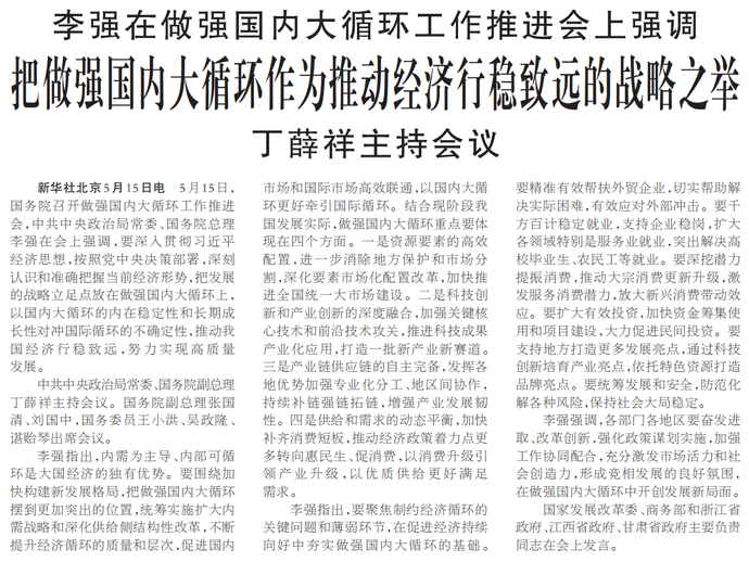 5月15日,国务院召开做强国内大循环工作推进会,中共中央政治局常委、国务院总理李强在会上强调,要深入贯彻习近平经济思想,按照党中央决策部署,深刻认识和准确把握当前经济形势,把发展的战略立足点放在做强国内大循环上,以国内大循环的内在稳定性和长期成长性对冲国际循环的不确定性,推动我国经济行稳致远,努力实现高质量发展。(今日《人民日报》1版)