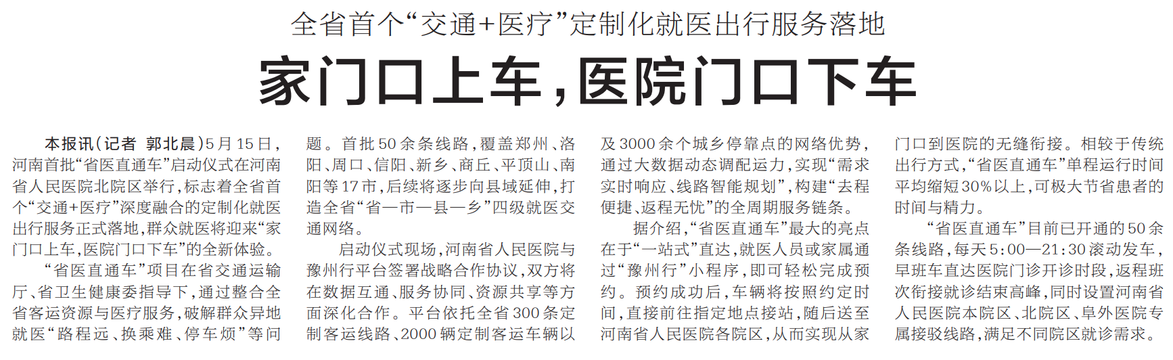 5月15日,河南首批“省医直通车”启动仪式在河南省人民医院北院区举行,标志着全省首个“交通+医疗”深度融合的定制化就医出行服务正式落地,群众就医将迎来“家门口上车,医院门口下车”的全新体验。(今日《河南日报》1版)