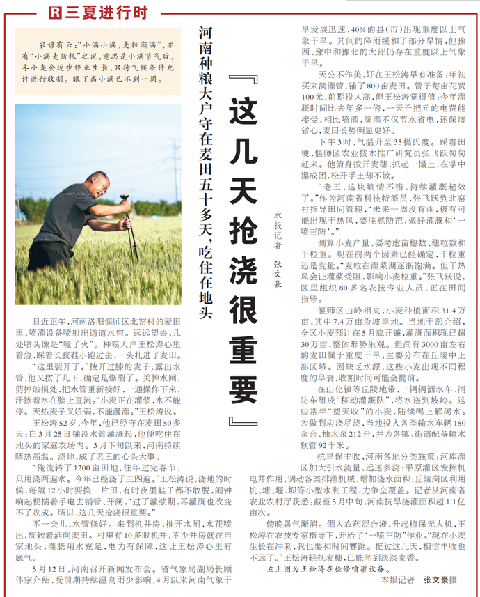 日近正午,河南洛阳偃师区北窑村的麦田里,喷灌设备喷射出道道水帘。远远望去,几处喷头像是“哑了火”。种粮大户王松涛心里着急,踩着长胶鞋小跑过去,一头扎进了麦田。(今日《人民日报》2版)