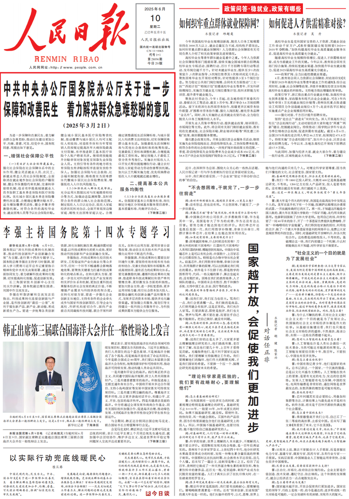为进一步保障和改善民生,着力解决群众急难愁盼,推动民生建设更加公平、均衡、普惠、可及,经党中央、国务院同意,现提出如下意见。(今日《人民日报》1版、2版)