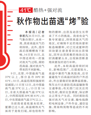 6月9日,省气象台预计,未来一周,我省高温天气仍将持续。此外,受冷涡后部横槽南下影响,14日至15日,北中部还将有一次强对流天气过程,需防范高温、强对流天气带来的不利影响。(今日《河南日报》2版)