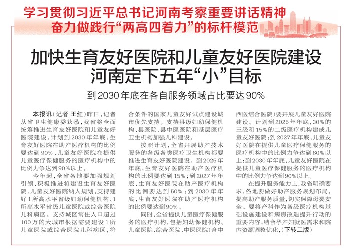 昨日,记者从省卫生健康委获悉,我省将全面统筹推进生育友好医院和儿童友好医院建设,计划到2030年年底,生育友好医院在助产医疗机构的比例要达到90%,儿童友好医院在提供儿童医疗保健服务的医疗机构中的比例力争达到90%以上。(今日《郑州日报》1版、2版)