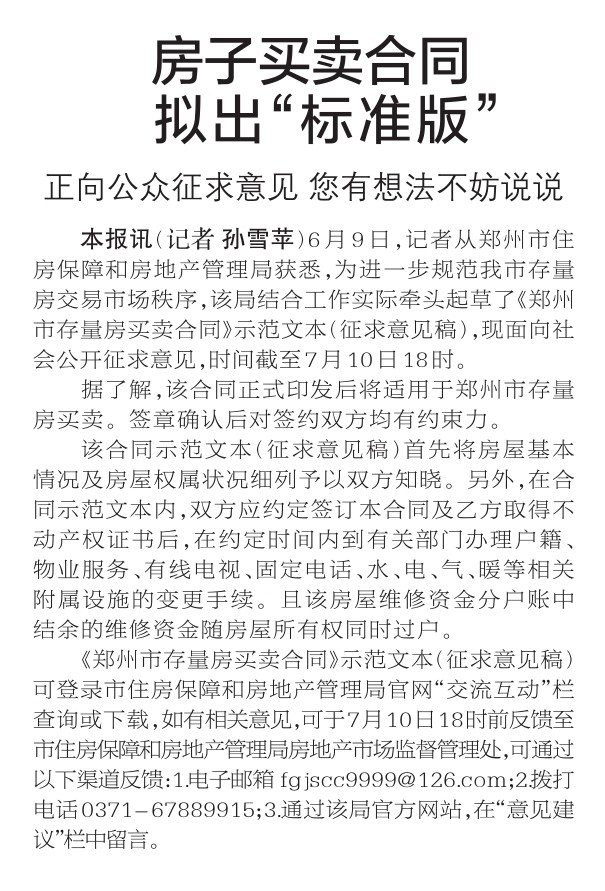 6月9日,记者从郑州市住房保障和房地产管理局获悉,为进一步规范我市存量房交易市场秩序,该局结合工作实际牵头起草了《郑州市存量房买卖合同》示范文本(征求意见稿),现面向社会公开征求意见,时间截至7月10日18时。(今日《郑州日报》1版)